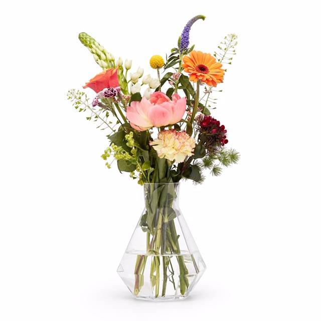 This unique crystal glass decanter that has been blown into the elegant shape of a diamond with its mouth, can either stand up straight or lie on its side without losing its contents. We have chosen this form to make you aware that not only diamonds but also water is becoming increasingly rare. So treat water with care and serve it from a nice carafe.
