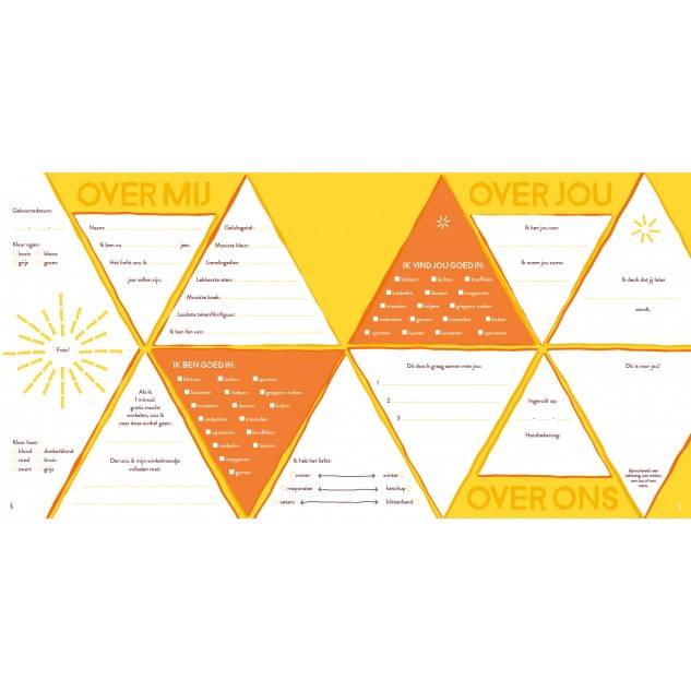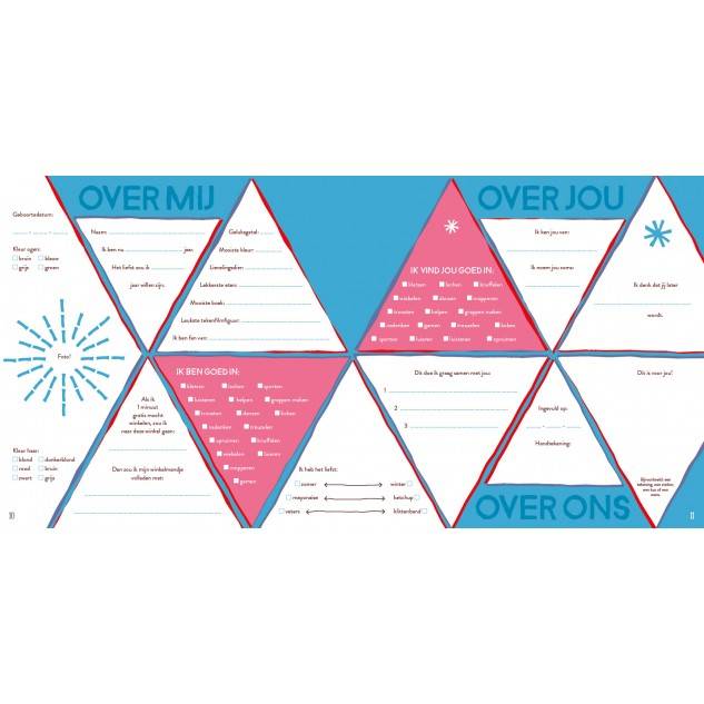 Who are your friends and girlfriends? What are they good at and what do they like? But also: what do they find special about you and what do they like doing together with you? In Friends! write your friends and girlfriends about themselves and about you. There are two variants available, one with a red cover (hearts) and one with a blue cover (stars). Both books have the same content, only the cover is different.
