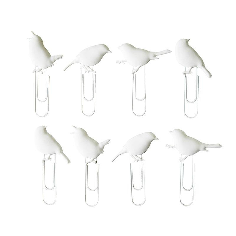 Nice paperclip set in white with birds There are 8 paperclips in a set and they are 7 cm tall.