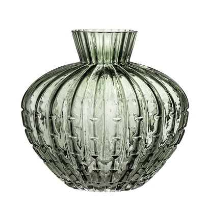 De vaas is gemaakt van groen doorzichtig glas. De vaas heeft een bolle vorm en loopt naar boven taps toe.
