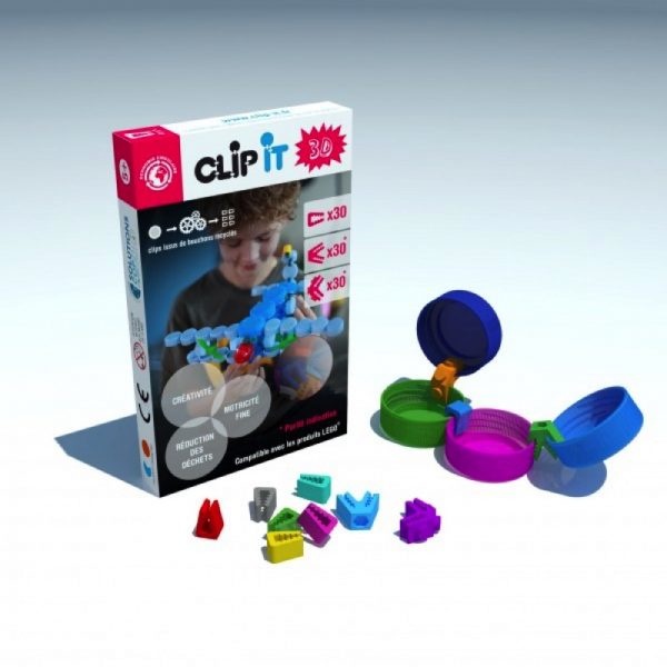Het vliegtuig-model wat op de achterkant van de verpakking staat dient als voorbeeld om te bouwen. Start met het verzamelen van plastic doppen in verschillende formaten en kleuren en klik alle doppen aan elkaar met behulp van de clips.