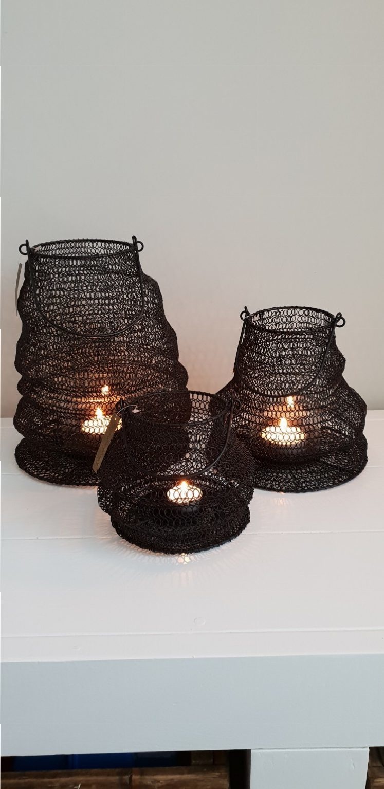 Stijlvolle windlichten gemaakt van ijzer en bij ons verkrijgbaar in het zwart, mintgroen of goudkleur. De windlichten hebben aan de bovenzijde een hengsel en kunnen dus uitgevouwen worden of deels gevouwen laten voor een speels effect. Deze windlichten zijn allen met de hand gemaakt dus hier en daar wijken ze iets van elkaar af en steekt er een sprietje anders uit dan bij een ander exemplaar maar dat geeft juist het speelse effect. Leuk om neer te zetten op een tafeltje of vensterbank of meerdere exemplaren bij elkaar.