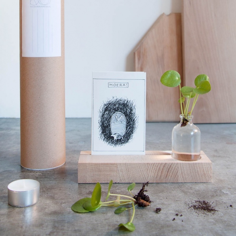 Geef die fijne kaart, dat mooie kunstwerkje of een dierbare foto een mooie plek in de massieve beukenhouten houder Hold it +. Een houvast voor dat ene aandenken waar jij vrolijk van wordt. Het pakket bestaande uit de houder, het glazen vaasje en het waxinelichtje zitten feestelijk verpakt in een kartonnen koker.