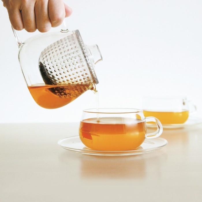 1-kop's theemok van het Japanse merk Kinto. Kinto maakt simpele stijlvolle maar simpele producten: Plaats theekruiden in de filter, plaats deze in de mok, giet hierover heet water en laat de thee trekken zolang als nodig wordt gevonden.