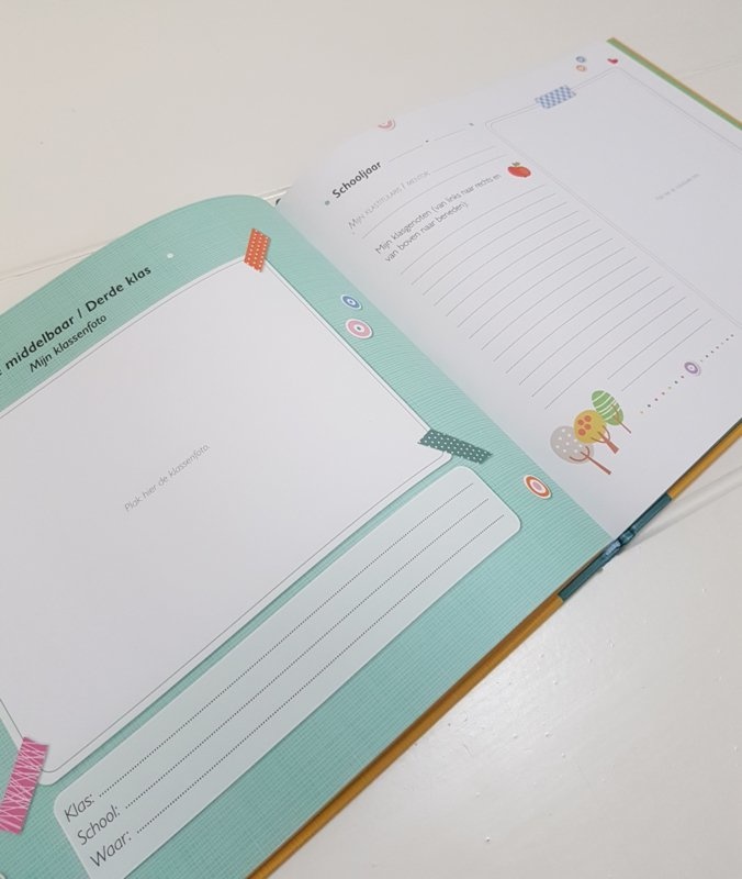 Je kunt per schooljaar aangeven wie de meester, juf of mentor was, en de namen noteren wie er allemaal op de klassenfoto staan. Ook kun je tussentijds nog leuke foto's van je kind in het boek plakken. Bij de basisschool pagina's kun je ook de lengte en gewicht noteren van dat jaar.